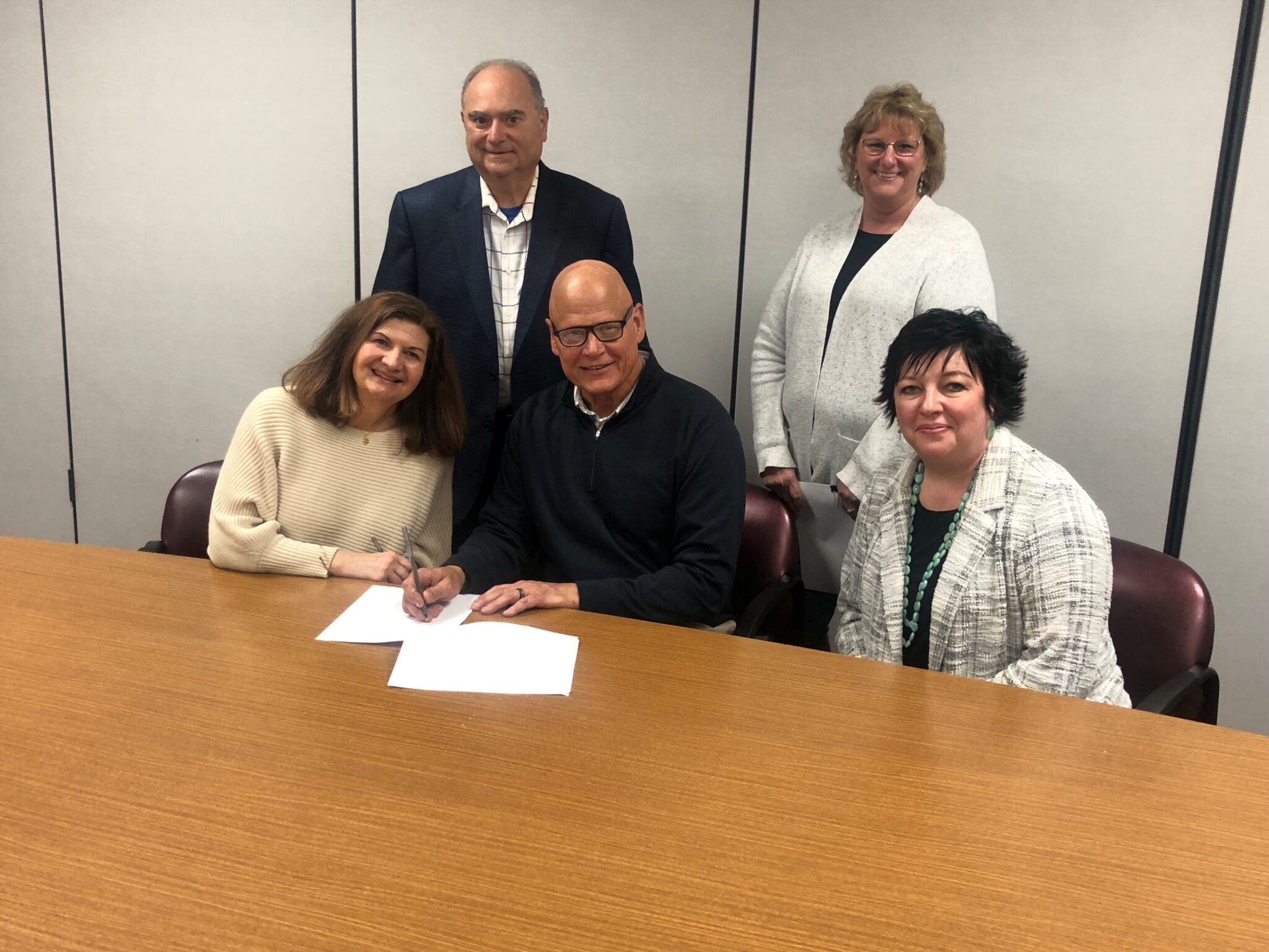 Taking part in the contract signing to formally establish The Resource Center Dr. John Vona Smile Fund are, from left, Linda Hart and Dr. David Vona, children of Dr. John Vona; Greg Krauza, President of Filling the Gap’s Board; Cindy Hitchcock, Filling the Gap’s Chief Executive Officer; and Tina Downey, Development Officer at Chautauqua Region Community Foundation.